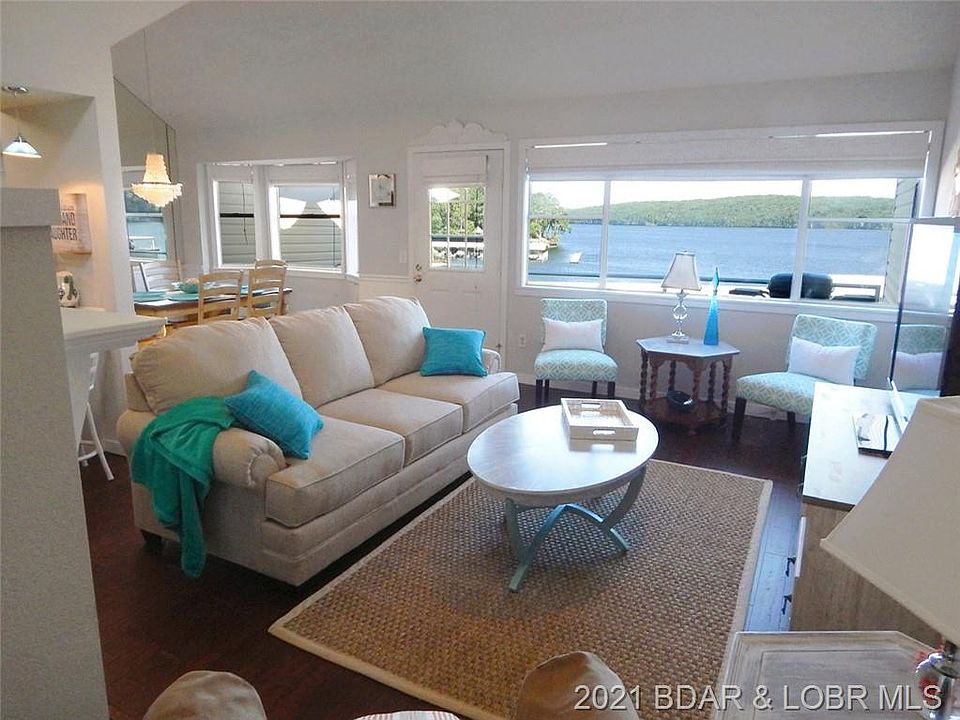 All About the water views, sunrise to sunset. Spacious 2 bedroom, 2.5 bath townhome. Lakefront privacy! 2 bed, 2.5 bath townhouse style condo with no one above or below. The lower level has 2 en suite bedrooms, the laundry room, and another private deck. Reserved parking in your covered carport just steps outside your front door. The main living area has an open floor plan with vaulted ceilings and lots of windows for natural light, wood floors, a wood-burning fireplace, granite countertops in the kitchen, a breakfast bar, a dining area, and a powder room. Great screened and open decks for taking in the main channel lake views.