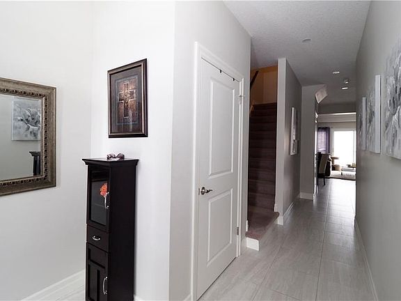 Minutes to Hwy 8! This bright 2 storey townhome with a walk out basement is move in ready! Decorated in neutral decor with 1400 sq ft of living space. 3 carpeted bedrooms with master ensuite and two closets. Main bath has under counter lighting. Main floor with ceramic and hardwood with bright kitchen and ample cupboard space. Stainless steel appliances; 9 ft ceilings on main floor; Sliders from great room with coffered ceiling and pot-lights; w/o to west facing deck. Main floor powder room. Garage entry to home. Full unfinished basement with walk out.