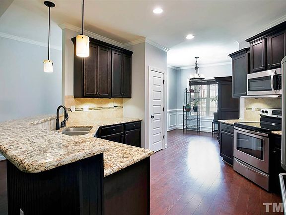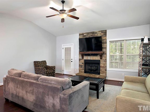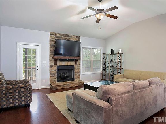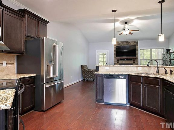 Freshly painted inside. Granite Counters, Tile back splash, Stainless appliances and oil rubbed bronze fixtures throughout. Hardwoods in living areas. Vaulted great room with stacked stone gas log FP. Spacious master with new carpet, soaking tub in bath and huge closet. Screened porch, deck and patio with fire pit. Large 2 car garage with sink. All appliances convey (as is) as well as sound bar under FP mantel. Large fenced yard. Cul de sac lot. No homes behind this house...private and quiet.