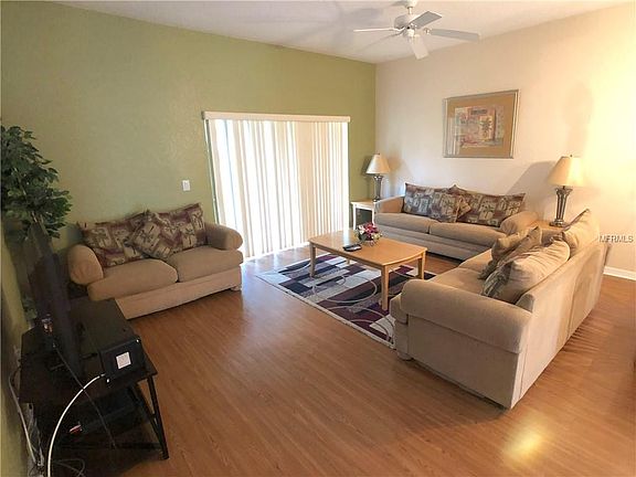 Wonderful end unit town home located in the popular Regal Palms community! This home is a 4 bedroom 3 and a half bathroom two story home. The home features an open floor plan with a combined living and dining space with plenty of natural light supplied by the sliding glass doors. The large master bedroom comes furnished with a huge bed! The master room also features an ensuite bathroom as well as sliding doors to access the private balcony. Spacious guest bedrooms, two of them are furnished with two beds in each to accommodate additional family and guests! Truly an excellent opportunity to be a part of the fantastic Regal Palms community and enjoy all the amenities this community has to offer including its gorgeous community pool!