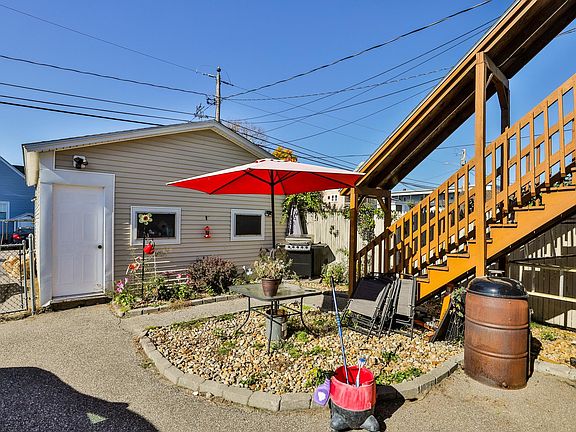 Great Owner Occupied or Investment property. Ready to move-in or rent on day 1. 1st floor has a large open kitchen with tons of cabinets and laundry closet with washer/dryer that's open to the living/dining rooms with hardwood floors. 1 bedroom and 1 full bath. 2nd floor is 4 rooms 2 bedrooms with wood flooring, large sunny applianced kitchen, huge master with skylights and a 2nd regular sized bedroom. All utilities are separate. Full basement for storage and possible workshop. There's a 2 car detached garage plus parking for an additional 3-4 cars, Great side yard and patio area. Notice to show please, Assisted showings required.