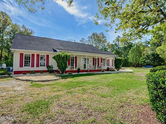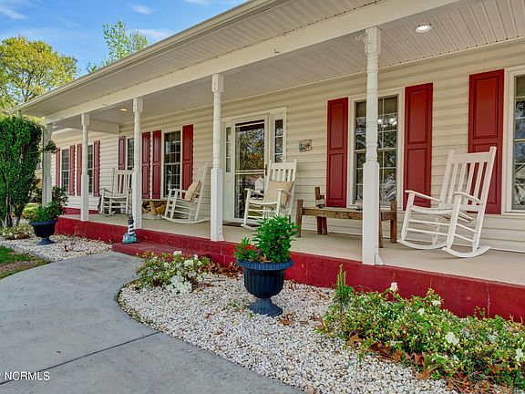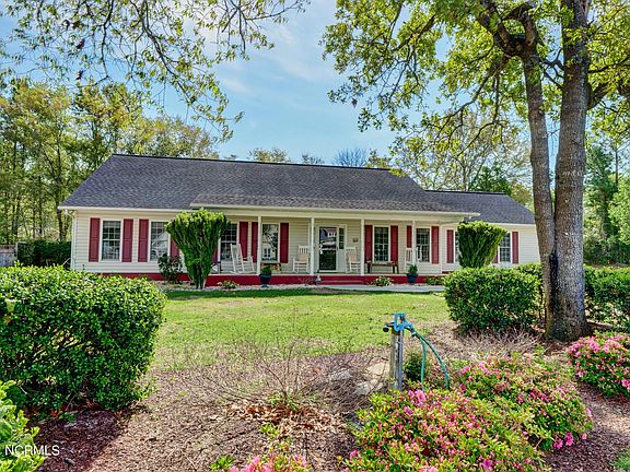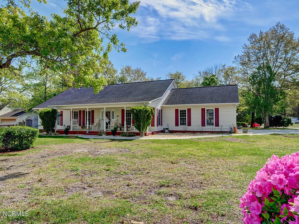 Southern Charm and attention to detail await you in this custom built home by Carl Duff. The water access, gated Community of Chadwick Shores with close proximity to Topsail Island, Base and midpoint between Wilmington & Jacksonville is the perfect location. Corner lot, over a half acre with an established yard designed for privacy with several vignettes to enjoy outdoor living to the fullest, whether it is on the expansive covered front porch, the back patio with a SunSetter Retractable awning or the patio off of the Florida Room. Coastal living with a practical whole house Generac generator, covered gutters for low maintenance, several hose hydrants strategically located throughout the yard in addition to the hose bibs and outdoor electric. To the left of the home in a 50 AMP outlet that was used for an RV or a hot tub. The living room beams with natural light accentuating the vaulted ceilings and open floor plan to the huge kitchen. The en suite is oversized allowing enough room for plenty of furniture. Quality is the theme in this meticulously maintained one owner home!