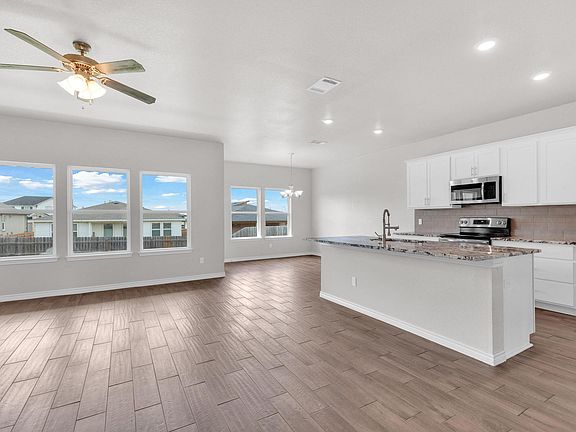 Open floor planLarge grassy areaRecessed lightingTiled back splashStainless steel appliancesGranite countersEat-in dining area