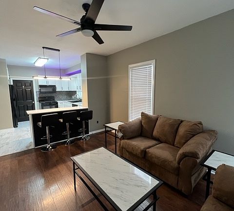Living Room Furnished with Sofa, Loveseat and modern coffee and end tables