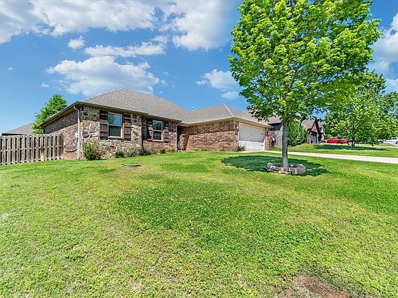 Location can't be beat on this well designed 3 bed, 2 bath home that provides instant curb appeal with its brick and rock exterior and professionally landscaped entrance. The open concept split floor plan is ideal for entertaining with the gas log fireplace that flanks the cathedral living room with wooden beams, open concept kitchen with granite counters and stainless steel appliances. Relax in the master suite featuring a sliding barn door, vaulted ceiling bath area with double vanity, tiled shower, garden tub, and 2 spacious walk in closets with lots of shelving. Great space for your outdoor entertainment from your privacy fenced backyard with large deck. Weatherton subdivision offers a community park and pool! Located in close proximity to all of the great amenities that NWA has to offer with easy access to I-49, this home is the perfect location between all NWA cities.