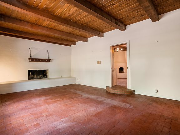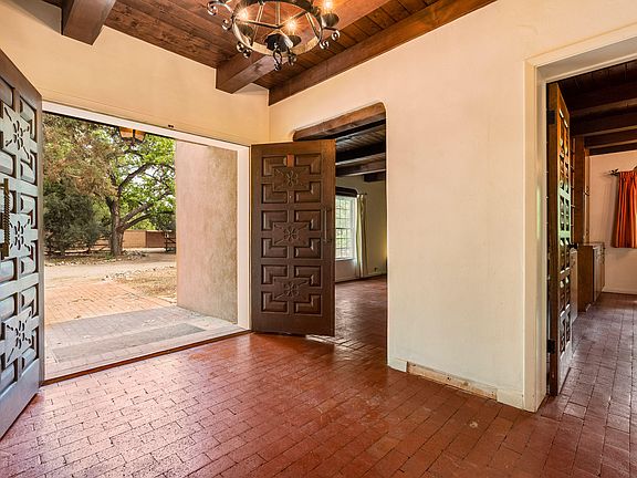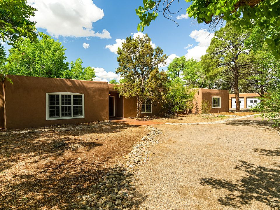 Charming Territorial adobe home with Wood ceilings throughout, brick and tile floors except for bedrooms, beautiful wood windows and French doors with true divided light. This home has a very versatile floorplan that can meet almost every need. Besides an attached two car garage there's a heated detached garage with a carport and a two stall barn. This lovely greenbelt 2 acre property is zoned A1.