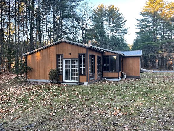 Cozy bungalow/ranch style home located on a very nice flat two acre lot on a paved town road. Currently 1 bedroom. Open concept kitchen/dining area, breakfast nook, rear sun porch with pellet stove. The home is currently heated with that stove and a mini split. There is a forced hot water baseboard in place but would require a new boiler. There are three separate sheds on the property in need of repair or replacement. Property to be sold "as is". Drilled well on site.