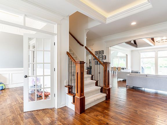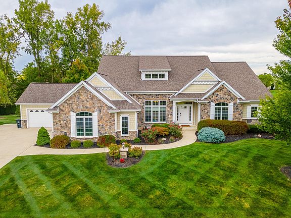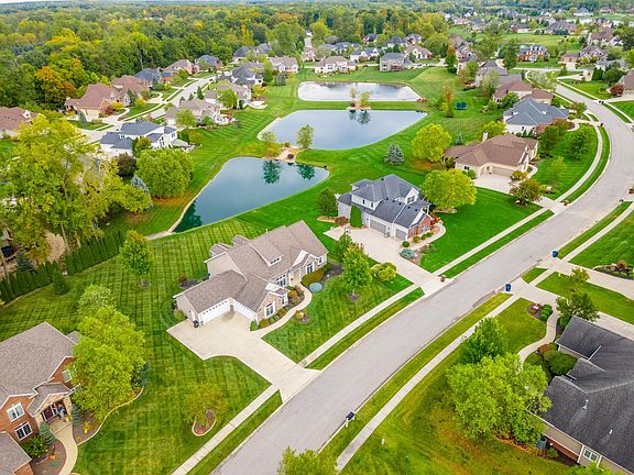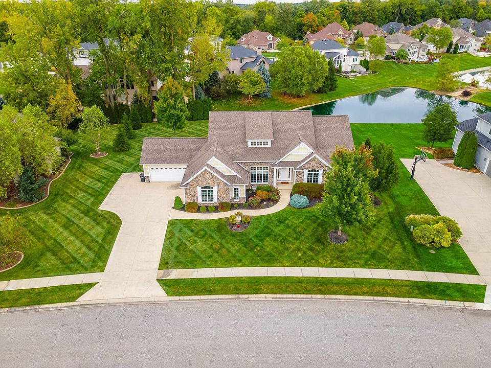 Sensational Five bedroom 2-Story floor plan, gorgeous lake view lot, in the Northwest Allen County school district. Professionally landscaped with Beautiful Curb appeal in the Bluffs of Twin Eagles. Entering the foyer, you are greeted with wood hickory floors in foyer, den, dining room, hallway, 1/2 bath & great room. The Great room has a wall of windows, open to kitchen and a stone gas fireplace leading up to cathedral beamed ceiling. The Chef's kitchen has custom cherry cabinets with granite countertops, tiled backsplash, commercial grade dual fuel double oven range, separate mudroom with built-ins, large pantry and laundry off kitchen. There is also on the first floor a good sized Den, This home has an extensive trim package with lots of crown moldings & coffered ceilings. The primary bedroom is a definite Suite, large, on first floor with a beautiful bath , tiled shower, large double vanity with make-up area. Large walk-in closets. Upstairs has two bedrooms each with their own full bath. Large open basement with lots of windows. The wrap around wet bar is something to see. Fully functional as it's own kitchen. Definitely great for entertaining. Downstairs also boasts 2 additional bedrooms, full bath, and exercise room. Also wired for sound and alarm. Backyard maintenance free deck and lot size are perfect for play and having your BBQ. Quality throughout.