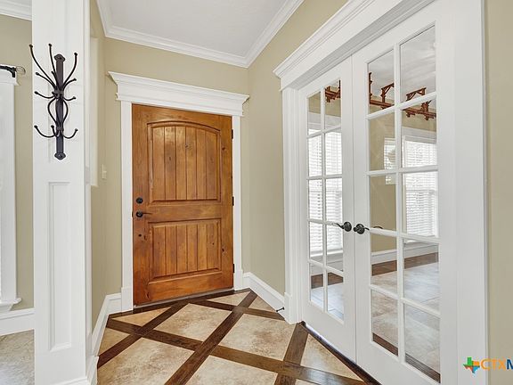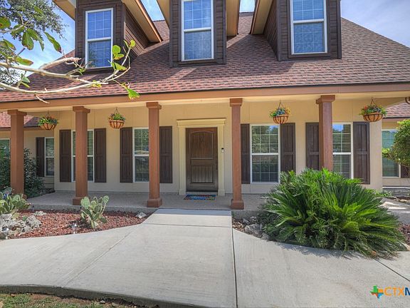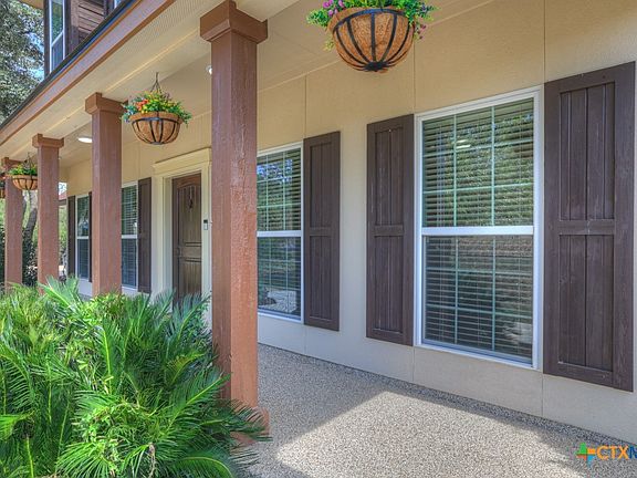 Nestled in the heart of the Texas Hill Country, a welcoming covered front porch leads you into this lovely 4-bedroom, 2.5-bath home that combines timeless craftsmanship with modern convenience. Designed with both comfort and accessibility in mind, the home features a spacious primary suite on the main floor, complete with a double vanity, whirlpool tub, and spacious walk-in shower with dual showerheads. An exterior door from the suite opens to a private ramp, offering easy outdoor access without compromising the home's elegant design. Inside custom cabinetry, built-ins, and exquisite trim work throughout give this home character. Custom cabinets, a large granite kitchen island and double ovens are ready for entertaining. The open living area has soaring ceilings, hardwood floors, and a see-through fireplace that creates a cozy yet refined atmosphere. The main level also includes a formal dining or living room and a study with French doors when you enter the home. A curved staircase leads to three additional bedrooms with brand new carpet, a large bathroom w/double vanity, and a versatile extra room above the garage. An oversized two-car garage w/built-in cabinets and work benches plus an air conditioned workshop has all the storage you need. Additional highlights include 2x6 exterior walls, radiant barrier roofing, 80-gallon water heater, and TREX composite decking on the back patio. There are two fruit trees plus a shady backyard offers both privacy & potential, ready to be transformed into your ideal outdoor retreat. River Chase amenities: 2 parks, a 58-acre park on Guadalupe River w/pavilion, hiking trails, camping grounds, and sports courts, plus a 32-acre clubhouse park w/pools, fitness center, walking trails, tennis courts, disc golf, fishing pond, & Veteran's garden. Minutes to Gruene, restaurants, shopping, music venues, theatres, and health care, and convenient to both Austin & San Antonio.