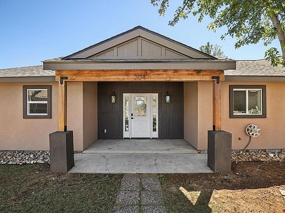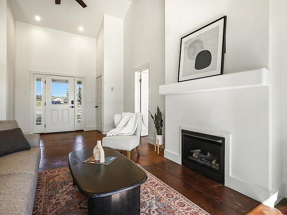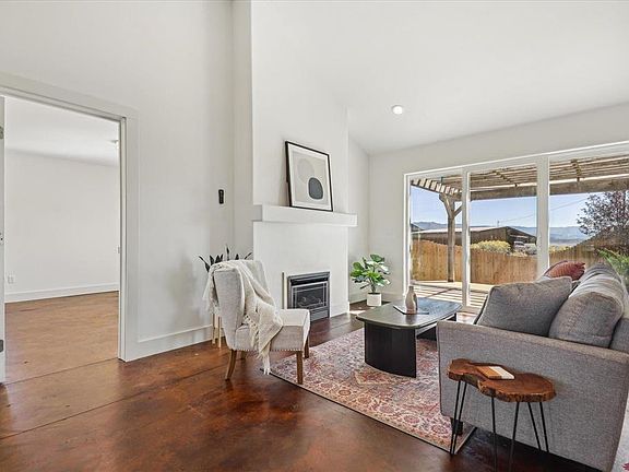 This completely renovated three bedroom home, located at the end of a peaceful cul-de-sac, offers a perfect blend of modern efficiency and rustic charm with stunning mountain views from the back porch. The open-concept floor plan connects the kitchen, dining, and living areas, all featuring artistically stained concrete floors with in-floor radiant heating. A gas fireplace in the living room adds a cozy touch. The kitchen is equipped with new stainless steel appliances, including a custom hood, making it the perfect gathering space for family and friends. The spacious primary suite offers sliding patio doors leading to the backyard, a walk-in closet with a solar tube, a double vanity with a marble top, and a custom-tiled walk-in shower. Two additional bedrooms are located on the other side of the living space with a full bath. Outdoors, the backyard is perfect for entertaining, with a concrete patio and pergola, along with power and gas hookups for a BBQ or fire pit. The barnwood storage shed is equipped with power and lighting, providing additional convenience. The roof is brand new with ice and water protection applied over the entire roof, not just the valleys, and includes a warranty. The exterior features thoughtfully refreshed stucco by Integrated Wallworks, along with new window bump outs, fresh board and batten siding, and a fully fenced backyard with a new back fence. Enjoy breathtaking mountain views while relaxing in this serene setting. The home also features new paint throughout the exterior, all-new interior and exterior doors, new windows, new stainless steel appliances, all new insulation, and new electric devices and light fixtures inside and out. The radiant in-floor heat is supplied by an energy efficient Steffes electric thermal storage system for maximum electrical savings. With a covered front porch and a community playground nearby, this home provides a balance of tranquility, efficiency, and comfort.