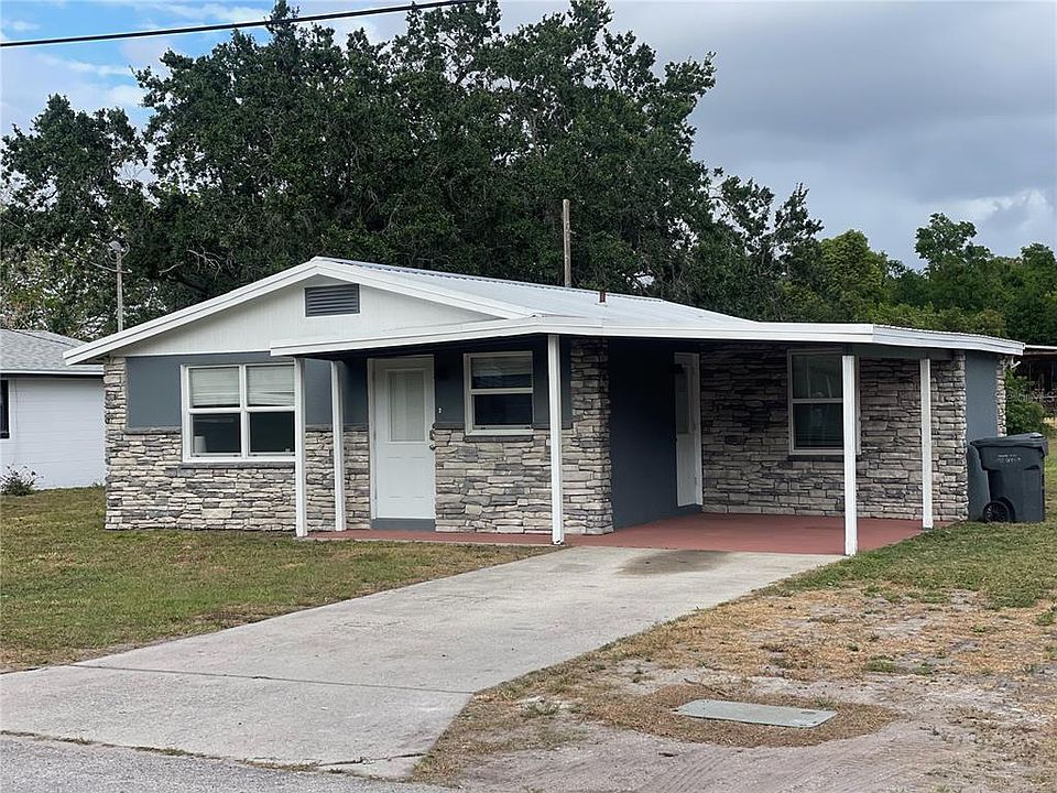 *** Back on Market - Financing did not go through *** 204 Gandy St is a charming, one-of-a-kind, single-family home located in the heart of Auburndale, Florida. With just under 1,000 square feet of living space, this home offers three bedrooms, one full bathroom, and a one-car covered carport. The front of the home and each corner are edged in stone veneer. As you enter the home, you will be welcomed by an open and modern living room that features a beautiful stone-finished accent wall. You will be blinded by the shine of the white and gray marbled porcelain tile floors. Recessed lighting illuminates the entire home, and there is crown molding finish throughout. The kitchen is equipped with modern stainless steel appliances, white quartz countertops, and high-profile cabinets. The waterfall island holds a split farmhouse sink and more stone accenting in the kickplate. Use the kitchen door that opens to the carport to keep you dry on a rainy day. A walk down the hallway will take you to the bedrooms. Luxury awaits you in the full bathroom. The porcelain tile climbs up the walls and embraces you at every turn, even while you shower under the rainfall. The floating double vanity has 2 bowl sinks to share, each with a waterfall faucet. The oversized laundry room is just off the bathroom. The entry is marked by a custom barn door, and natural lighting shines in from a window overlooking the front yard. With the home situated toward the front of the property, there is plenty of yard in the back to fence in and ample space to add a pool. A must-see - don't miss out on the chance to make this gem yours!