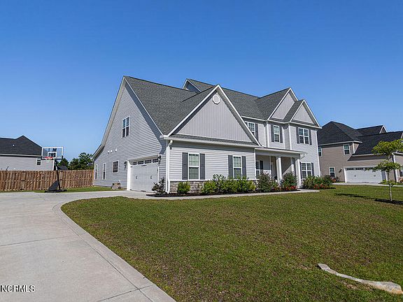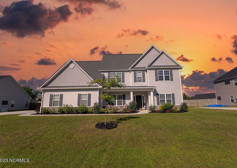 Prepare to have your jaw dropped! This stunning home in Onslow Bay is FULL of upgrades and wish list items! 5 bedrooms PLUS A LOFT- HUGE1st floor master, Laundry on 1st floor, ALL Kitchen appliances...YES! Fence? Check. Blinds? Check. Gorgeous professional quality landscaping? Check. Covered back porch? CHECK! It doesn't stop there - ceiling fans in every bedroom (a must have for those Carolina summers!), custom closet in the primary bedroom, overhead storage in the garage, gutters, gorgeous kitchen with beautiful tile backsplash, the list goes on and on. You do not want to miss out on this amazing home located close to base, close to shopping, in a neighborhood with amenities, this truly is a ''honey stop the car!'' property. Featuring FIVE bedrooms, three and a half baths, first floor master, large open living space, side load garage, trey ceiling detail, large back patio and covered porch, and more!