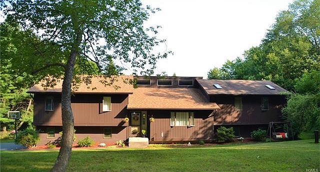 Unique contemporary 4 bedroom, 2896 sq. ft. tri-level with open, split bedroom floor plan with artistic style and flair. Soaring cathedral ceilings in the living room,dining room,kitchen and master bedroom, Beautifully renovated kitchen with granite counters that opens to dining area.Hardwood floors, specialty windows, 3 sky lights. Spacious master bedroom with walk in closet, sliders to deck and private bath with corian counters, dual vanities, shower and tub. Den/office, huge family/recreation/entertainment room on lower level. Parklike, private backyard with mature treed border. 2 tier deck with 27 above group pool and hot tub. Only 1 mile to Pine Bush, village shopping and restaurants. And close to winery, Shawangunk River and town park. Great house and price!
