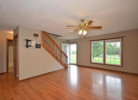Charming 1.5 story home on 1.5 acres of treed land. Entryway leading into living room with wood floors and large front windows with tons of natural lighting, eat-in kitchen with stained cabinets, tiled backsplash and sliding glass doors leading out to deck. Spacious master bedroom with ceiling fan and wood floors, two full bathrooms and 5 other bedrooms. Full finished basement with family room. Fenced in backyard with deck, storage shed and above ground pool surrounded by large trees that offer plenty of shade!