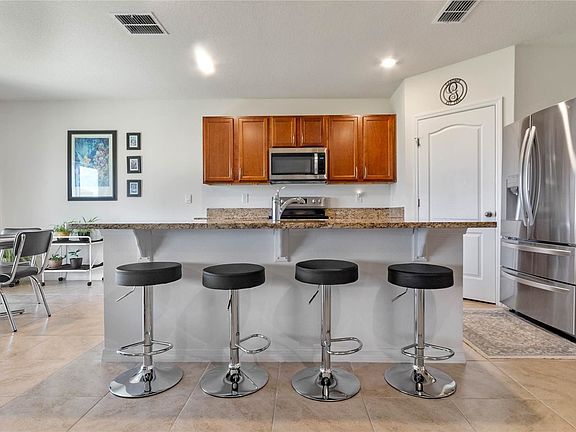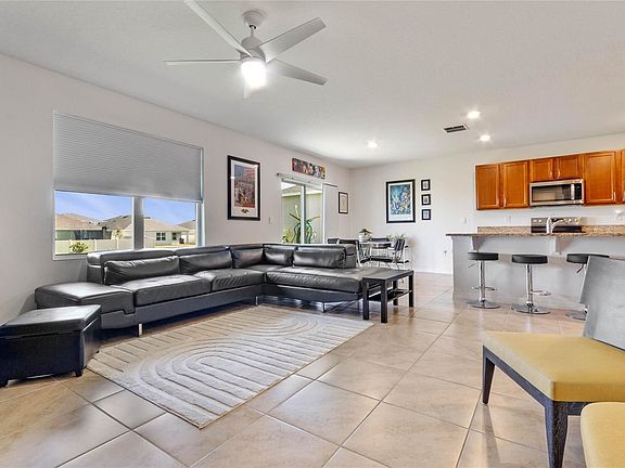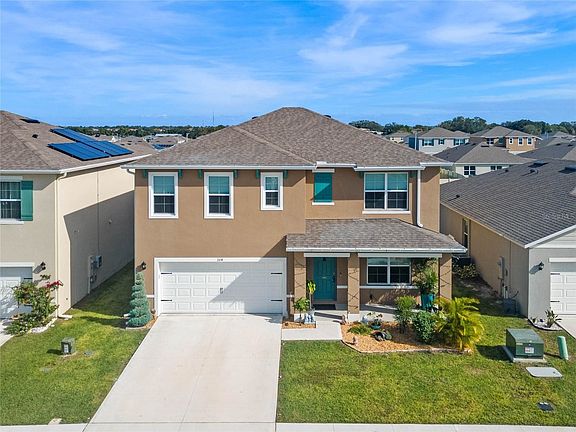 Looking for a new home but don't want to wait? Look no further than this Hayden model by D.R. Horton. This home was built in 2022 and features 5 bedrooms with 3 full bath and is all concrete block with an amazing living space and open concept floor plan. The kitchen features granite counter tops, center island with breakfast bar seating, loads of cabinets, stainless steel appliances and walk in pantry. The kitchen is open to the spacious family room making this a great gathering place for entertaining. As you enter the foyer, you will notice the flex room on the right that can be used as a living room, office, craft room and more! There is a bedroom and full bath on the first floor for convenience and this room is currently being used as an office featuring built in cabinets and counter top. Upstairs you will find the additional 3 secondary bedrooms and full bath along with the master suite. There is an upstairs living space/loft that is currently being used as a sitting area/movie room. The master suite is oversized and you will find 2 walk in closets, dual sink vanity with granite counter top and a walk in shower. All the windows have easy open and close shades and the sliding door has the stackable panels. The ceiling fans have been upgraded, the kitchen and baths have soft close cabinets and new hardware. The home has smart home technology! The landscaping has been updated and there are gutters around the whole house. The 2 car garage has 2 hanging storage racks! Don't miss the fruit trees out back! Tangerine, mango, papaya and avocado are in the backyard. Legoland resort is close by and you can enjoy boating on the Winter Haven Chain of Lakes. Visit the Disney parks within 30 minutes! Call today for your private showing!