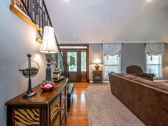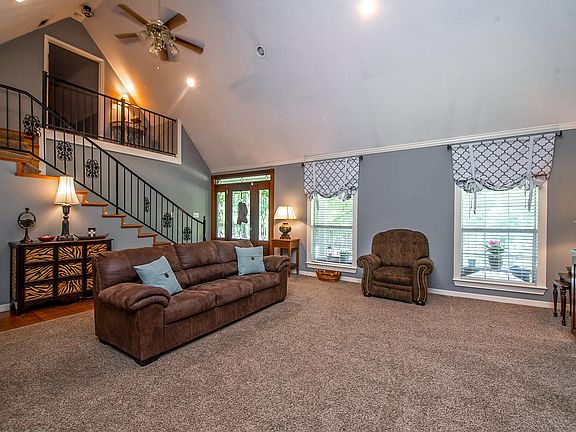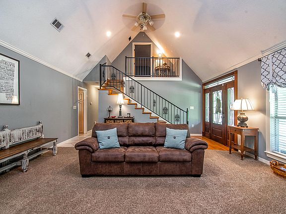 This beautiful Colonial-style home is 5 BR, 2.5BA home with 2550 sq ft. Main floor has approximately 2050 sq ft with 3 BR, 2BA, living room, kitchen and breakfast area, laundry room, safe room (located under the stairs), and an additional flexible living space. The large master suite has a full bath with separate walk-in closets. The other two bedrooms share a large bathroom with plenty of extra storage. The living room has a beautiful, vaulted ceiling and a large built-in entertainment center. The additional living space, located just off the kitchen and breakfast area, has a large window overlooking the front yard and is currently being used as a den/office.Upstairs has approximately 500 square feet with 2 bedrooms and a half bathroom. The larger bedroom could also be used as a playroom
