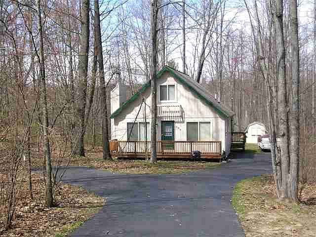 Well kept 1200 sq. ft. 3 bdrm w/loft, chalet in quiet subdivision close to Higgins Lk. S. State Pk. Wood burning fireplace, larger windows, large deck in front and wooded lot. Furnished.
