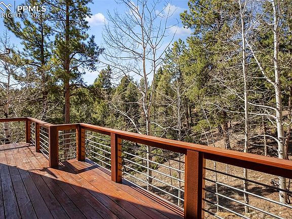 Well-maintained home situated on two lots totaling 1.38 acres, offering stunning views of Pikes Peak and exceptional privacy. The home has been completely remodeled. Functional kitchen equipped with stainless steel appliances, including a refrigerator, dishwasher, gas range/oven, and trash compactor, along with Alder cabinets. Stackable washer/dryer. The dining room walks out through a sliding door to a deck that wraps around. A two-tiered spacious deck, perfect for entertaining! The living room is cozy and inviting, featuring a natural gas stove. Most of the furniture is included, and honeycomb blinds are installed throughout the home. The main level includes a bedroom and a full bathroom. Upstairs, there are two additional bedrooms and another full bath. One of the upstairs bedrooms has an open wall that overlooks the main level. This log-sided home has a durable metal roof and is supported by a well, cistern, and septic system. It is serviced by Core Electric and Colorado Natural Gas. Suitable as a full-time residence or vacation rental, the home is located in a peaceful setting. Additional features include a storage shed, dog run, and a beautifully treed lot with Ponderosa pine and Aspen trees. A pleasure to show!