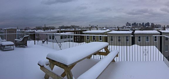 Entertain on your furnished roof-top deck with gorgeous views of the Boston Skyline. Two years young from the ground up, this condo is nearly brand new. Unit has deeded parking at building with shared guest space. Granite counters in large maple eat-in kitchen. Gleaming hardwood floors throughout. Walking distance to the T and park. A/C, laundry and storage.