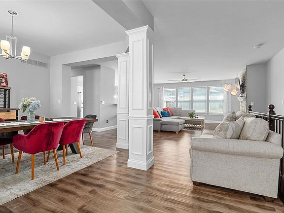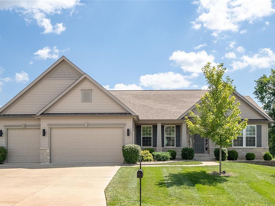 A 3bd, 2bth Ranch in Lake St. Louis! This modern build offers an open concept with gray hardwood floors, 9ft ceilings and a number of windows for tons of natural light. The open kitchen displays a stainless steel appliances, 42'' custom white cabinets, a breakfast nook and breakfast bar. The countertops and center island are covered in gray/white marble Quartz. A gas fireplace surrounded by stone highlights the living room and accented pillars surrounding the dining area connect the open living spaces. In the hallway across from the hall tree is the main floor laundry room. The east wing offers an owner's suite with a custom walk-in closet, a bath w/both tub, shower and two separate vanities. The two secondary bedrooms are on the west end of the home along with a full bath. A 3 car garage and full basement with rough-in and egress window allow for plenty of storage. The well manicured landscaping complements this must see home in Brookfield Crossing!