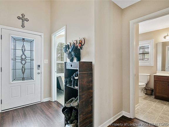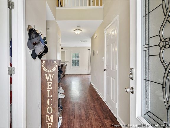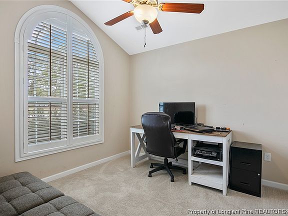 This meticulously maintained, charming residence exudes perfection sitting on over half an acre lot. Upon entering, you'll be greeted by the foyer with a soaring, two-story ceiling and an upstairs balcony. The interior boasts three comfortable bedrooms, two and a half bathrooms, and a versatile first floor bonus room with closet that could serve as an office or additional 4th bedroom. All bedrooms are located upstairs, along with the laundry room. The owner's suite features double doors, a vaulted ceiling, and ample space. The luxurious master bath features a garden tub, separate shower, double sinks, and spacious walk-in closet. The open-concept floor plan is ideal for modern living with cathedral ceilings throughout several rooms and custom plantation shutters that adorn all windows. The backyard is enclosed by a privacy fence and features an in-ground fire pit.