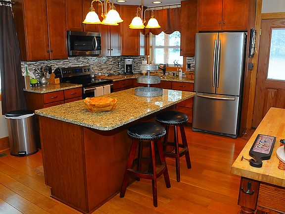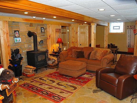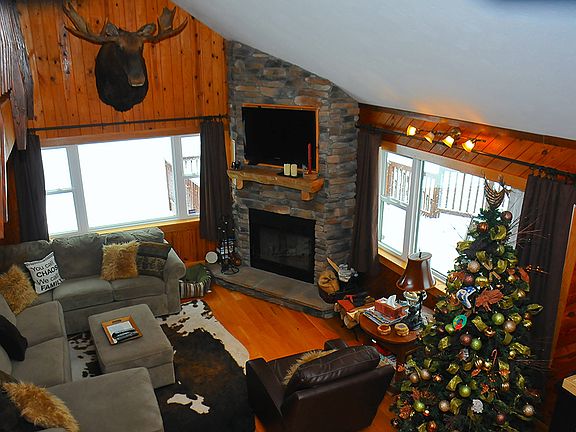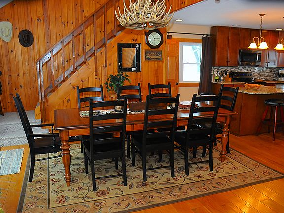 Relax after a day of exploring the outdoors in the beautifully remodeled mountain home. Granite counter tops throughout kitchen with center island and rear covered porch for grilling. Three full baths. Natural Flagstone floor on game room level with wood stove, full bath and bedroom. Open living room with vaulted ceiling bedroom area overlook. Dining area offers antler chandelier. Master bedroom & bath on the 1st floor. Two bedrooms & bath on 2nd floor. Great entertaining home with large wrap around deck. hot tub plus outdoor fire pit. Great outdoor storage garage for all your toys and lawn equipment. Skiing, hiking, biking trails, and golfing are all right out your front door!