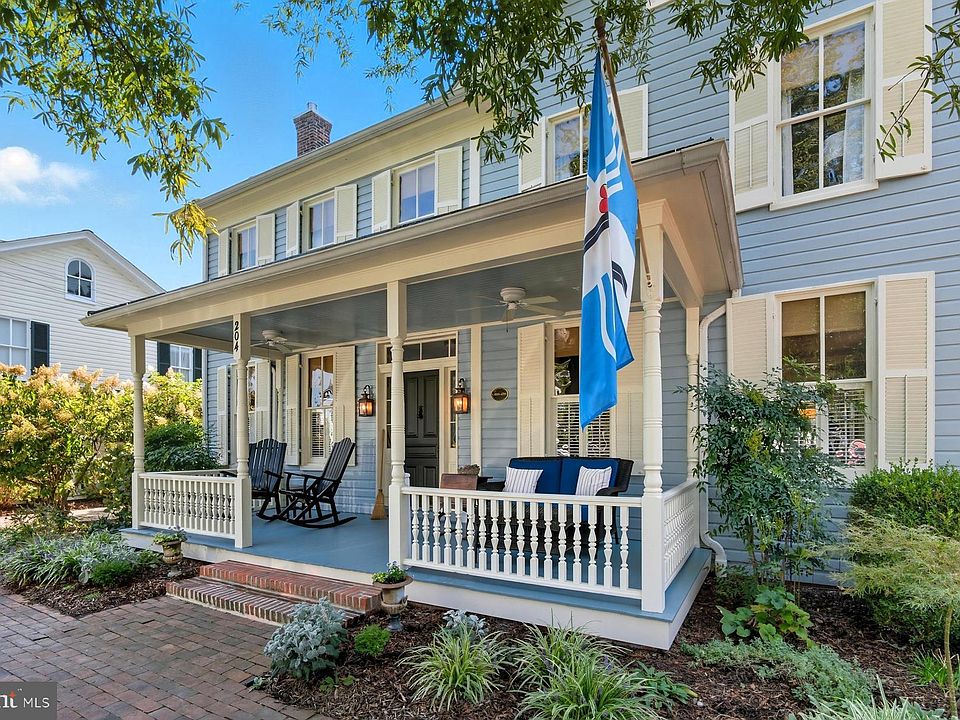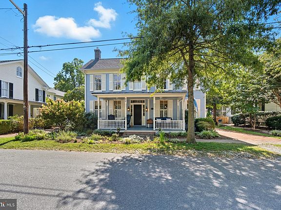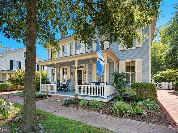 Step into history at the Thomas-Kirby House (c.1860), a charming renovated colonial in the heart of town with picturesque street views toward Saint Michaels Harbor. This light-filled historic residence showcases beautiful hardwood floors, two staircases, detailed millwork, and rich wood accents throughout. The welcoming foyer with its 'Seaport' hand painted mural wallpaper opens to a cozy study with fireplace and custom built-ins. The comfortable dining room flows seamlessly into the updated kitchen, appointed with a new center island, upgraded features and appliances. A double-sided fireplace serves both spaces, adding warmth and character. The light-filled living room, complete with its own fireplace and entertainment center(which conveys), opens through French doors to an extended brick patio, perfect for indoor-outdoor living. Upstairs, the stunning primary suite with its cathedral ceiling, offers large built-in wardroom space, gardens views, a private balcony, and beautiful ensuite bath featuring a clawfoot tub and glass-enclosed shower. Two additional large guest bedrooms share a full bath with a luxurious steam shower, and a conveniently located second-floor laundry room completes this level. Outside, a charming brick footpath winds behind the home, connecting to an off-street brick driveway. The private backyard with its new cedar shed provides a tranquil retreat with mature trees and lush landscaping, while benefiting from the extended view into St Mary's Square. With its historic charm, modern comforts, and extensive renovations made by the current owners, this home offers the perfect opportunity to enjoy the best of Eastern Shore living. *encapsulated crawlspace and attic; new American Standard Platinum 18 SEER System; Aprilene whole house dehumidifiers (2 units); complete restoration and painting of interior and exterior are just some of the Upgrades