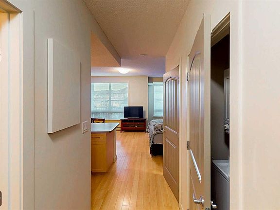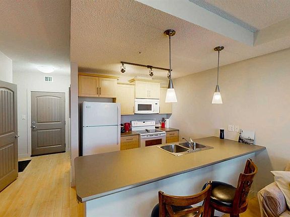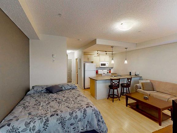 Welcome to The Vistas! ! Second floor, spacious and open bachelor suite in Eagle Ridge. Concrete building so very quiet for shift workers. Full size kitchen with huge island, 4 piece bath, in suite laundry and a spacious livingroom/bedroom making for the perfect hang out for the long distant commuter. Easy clean up with laminate flooring throughout. If you are a savvy investor then this is a unit that is super popular due to proximity of the bus stop, walking trails, restaurants, movie theatres, coffee shops and more. Spacious balcony from your living room where you can enjoy outdoor space that’s peaceful and private. Convenient gas hook up on the balcony if bbqing is something you love. This unit also comes with a titled above ground parking stall and a titled heated storage unit. On site gym for active residents when winter hits. Furniture is negotiable. Unit was freshly painted so all this unit needs now is YOU!