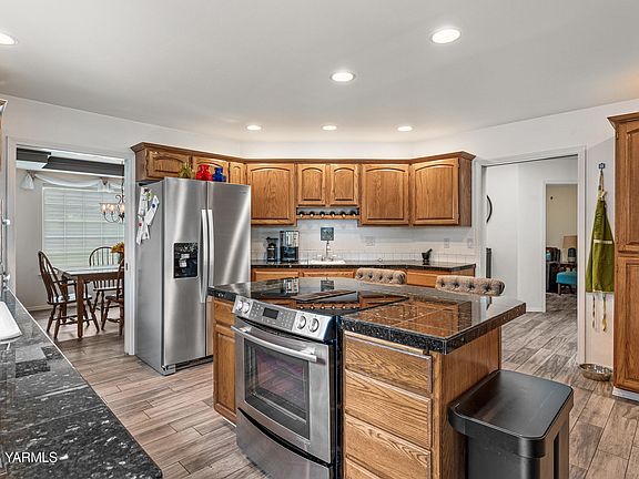 Quality well built, 2250 ft. home with attached oversized 2 car garage. This exceptional home features: 2-bedrooms w/ possible third, 2-bath- located in a very desirable walkable neighborhood about 7 minutes from downtown Yakima. Situated on a beautifully landscaped 0.88-acre lot, offering spacious living with updates, and some possible flexible spaces for optimum living. Truly one of a kind. When entering the home quality is evident- it features luxury vinyl plank flooring throughout, with tile in both bathrooms. Gas furnace with central A/C. Impressive sunken living room is huge with high ceilings and is the focal point for the home featuring a floor-to-ceiling rock fireplace and expansive windows, leading out to a private deck. Gourmet kitchen is a rare find with lovely granite countertops central island w/ seating. Two sinks one for dishes and a second for food preparation, double ovens, high-end appliances, a new refrigerator (2025), and a bright eat-in area that has direct access to the side patio--ideal for entertaining. The formal dining room conveniently located just off of the kitchen is filled with light and provides picturesque views of front yard. Dining room will easily seat six for family gatherings. A dedicated office offers flexibility and potential to serve as a third bedroom The impressive primary suite has a fireplace, double vanities, an oversized walk-in shower, and a large walk-in closet. ample light and private exit out to the fenced yard, Recent upgrades include: New roof (May 2025)New interior paint (May 2025)New refrigerator (2024)Black chain-link fence (installed 2024) enclosing the propertyExterior features:Oversized 2-car attached garage with finished flex room. RV parkingMature landscaping with multiple entertaining and seating areasIrrigation waterThis home offers comfort, privacy, and convenience in one of Yakima's most desirable communities.