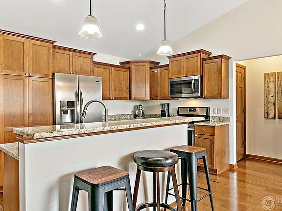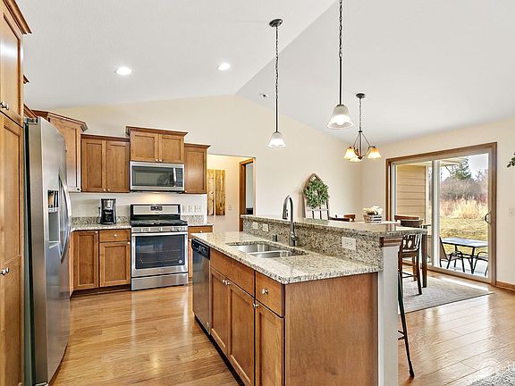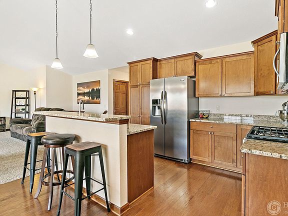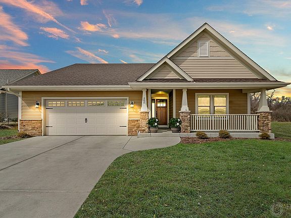 This beautiful ranch home in the desirable Heartland Village features an open concept layout. The spacious kitchen has: stainless steel appliances, granite counter tops, breakfast bar, and eat-in dinette. Great room includes beautiful stone surround gas burning fireplace and vaulted ceilings. Interior includes 6 panel doors, maple cabinetry, and a split bedroom layout. Other highlights: finished off garage with painted drywall on all sides, cellular blackout shades and fans in all bedrooms, master shower door with Flemish glass and oil rubbed bronze trim, huge unfinished basement with an egress window, and bathroom stub-in ready to be finished off! This premium lot backs up to a field to allow for more privacy and has a concrete patio.
