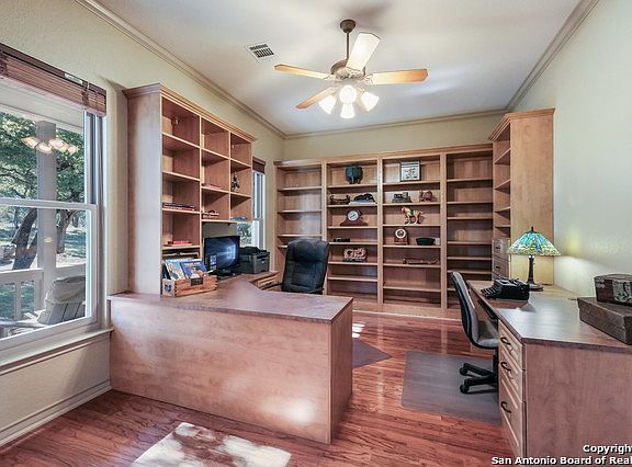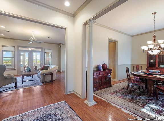Breathtaking Views on 5 Acres in Boerne. Custom Ranch Home 3 Bedrooms + Study. Open Floor Plan w/Lots of Windows Overlooking Guadalupe River Valley. Living & Dining Rm w/10 foot Ceilings, Wood Floors & Crown Molding. Corian Counters in Kitchen, Gas Cooking, Double Ovens, & SS Appliances. Spacious Master Suite w/Wood Floors, Walk in Shower & Garden Tub. 3 Car Air Conditioned Garage, w/Epoxy Floors, & Builtin Shelving & Storage. 900 sf Wood Deck & 1200 sf Metal Shop w/Electric. Guadalupe River Access.