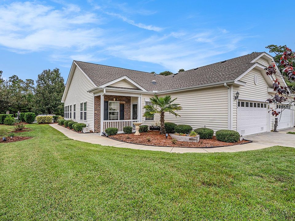 This charming 2-bedroom, 2-bath ranch-style garden home offers comfortable, low-maintenance living in the desirable Intracoastal Waterway community of Riverbend. The spacious owner's suite features vaulted ceilings, a large walk-in closet, and a private ensuite bath. The kitchen is equipped with Corian countertops, a pantry, ample cabinet space, and a whole-house water filtration system. Vaulted ceilings in the living area enhance the open feel, while luxury vinyl plank flooring throughout is complemented by tile in the wet areas. Enjoy serene pond views from the private patio, accessible through French doors, complete with an awning for shade and relaxation. This home is perfect as a primary residence, vacation getaway, or investment property. Nestled along the Waccamaw River, just blocks from Osprey Marina and adjacent to the public boat landing at Enterprise, Riverbend offers a scenic, maintenance-free lifestyle. Community amenities include a private floating day dock with gazebo, riverfront grilling area, scenic cypress walkway, clubhouse, and pool. Ideally located near Surfside and Garden City beaches.