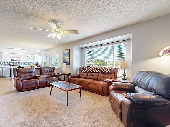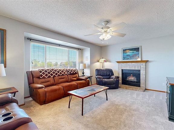 - Description: Living Room With Carpet Flooring, Ceiling Fan, Bump Out With Large Window, And Gas Fireplace With Brick Surround And Wooden Mantle.