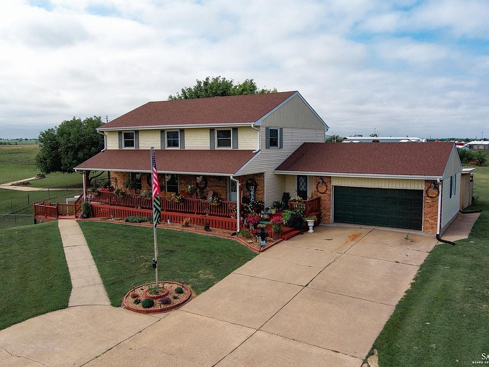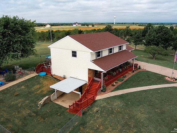 Home with a view on PAVED ROAD with a shared POND in SES school district! So many important updates....brand NEW ROOF, all vinyl windows, steel siding and MANICURED ACREAGE. You can spread out in the 4 bed 3 and 1/2 bath home with WALKOUT BASEMENT and 2 car attached garage. Large family room plus den with beautiful limestone surrounding Gas Fireplace on the main floor and rec room downstairs with walkout. Sit and enjoy the view from the well maintained sprawling covered front porch or equally nice back deck!
