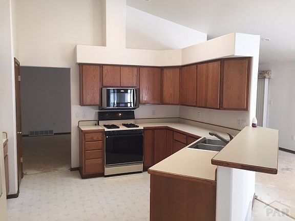 Pueblo West rancher features a master suite with 5pc bath and walk-in closet; 3 additional large bedrooms; large open kitchen with eating nook; formal dining room; large living room with fireplace; large great room in basement; additional large room in basement could be used for hobby room, office or another large bedroom; lots of closets throughout the home; vaulted ceilings and skylights; 3 car garage with built in shelving and mud sink; plus a huge covered deck! Low maintenance yard, corner lot. All appliances stay. Flooring will need to be installed.
