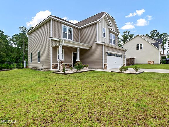 Welcome to 204 Seneca Ct, you will love being tucked back on a large cul-de-sac lot in the popular neighborhood, Village at Folkstone. Inside, there's 4 bedrooms, 2.5 baths and LVP flooring throughout. The master bath boasts a tile shower, soaking tub, and a huge walk-in closet. Out back, a massive 20x25 ft deck leads to an expansive yard with a natural tree lined barrier. The garage is a showpiece with painted walls and durable epoxy flooring. The Village at Folkstone is less than 15 minutes from North Topsail Beach, Stone Bay and the back gate of Camp Lejeune.