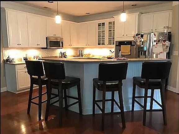 - Kitchen: Bar, Cabinets-Wood-White, Counter Tops-Granite, Hardwood Floor, Pantry, Island