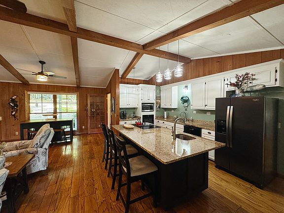 Immaculate 3 or 4 BR/ 3 bath home in prime setting on lakefront lot. Great cosmetic condition inside & outside. Open kitchen has lots of cabinet space w/ granite countertops & newer oven & refrigerator. Living rm w/ cathedral ceiling & built-in bookshelves & brick fireplace. Sep. dining rm. Spacious bedrooms w/ good closet space throughout. Main BR has walk-in closet plus a small office! Stairs lead to large bonus rm/bedroom (3) upstairs w/ mini-split HVAC. Wood flooring in downstairs bedrooms w/ tile in bathrooms w/ granite & marble countertops. Pella windows 2009. Enjoy a view of the beautiful lake from almost all windows & from the 18x18 screened porch & side deck. Large basement/workshop w/ interior & exterior entrances. Cypress siding, circular driveway, great landscaping, updated boat dock, small greenhouse & much more! Roof(2013).