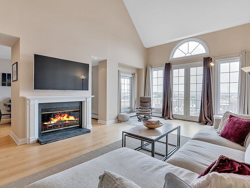 Luxurious Renovated Penthouse Duplex situated on Port Liberté’s signature canal with spectacular direct views of NYC, Statue of Liberty and Hudson River. Enjoy summer sea breezes from your private balcony or winter evenings in front of a roaring fire! This magazine-quality home boasts features including soaring cathedral ceilings, rich wood floors throughout, wood burning fireplace, designer lighting and so much more. The expansive social area, which opens to a private balcony, will accommodate your gatherings of friends and family, and offers generous space for full sized furnishings. The designer curated open-plan kitchen offers imported Italian cabinets, imported Brazilian Granite counters, tile backsplash, generous workspace with breakfast bar and high-end appliances boasting names like Sub-Zero, Bosch and Wolf. The updated chic and modern guest powder room will ensure the comfort and privacy of your cherished guests. The intimate level of the home offers two 5-star hotel style main suites! The primary suite with stunning views, boasts a fully renovated luxury spa bath with heated floors, impressive dual vanity, stone and Porcelanosa accents, strategically designed lighting, separate customized dressing area, deep soaker whirlpool tub and separate shower. The other main bedroom, also with magnificent views, offers its own en-suite bath with heated floors, custom vanity, designer stone accents and generous custom closet dressing space. Other features of this home are full sized in-home laundry center, zoned heat and central air conditioning, generous storage, included garage parking and full Port Liberté amenity services including 24-hour gatehouse security, professional style fitness facility, two outdoor pools, outdoor play area, tennis courts, basketball court, fenced dog run, designated green spaces, free guest parking and idyllic waterfront promenades. Onsite also: in the fitness facility are personal trainers and massage therapist; professional offices and Liberty Montessori: The Place For Learning daycare and preschool and the renowned Hudson House event facility with acclaimed rooftop Stork Club and Felina Steak House. Maintenance includes heat, hot water, garage parking and use of all amenities. Easy commute via onsite high-speed ferry or Weekday Shuttle to Grove St PATH. Just minutes to Liberty Newark Airport and just seconds to major highways.