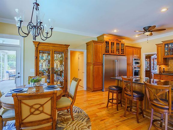 - RoomKitchenFeatures: Granite Counters, Recessed Lighting, Ceiling Fan(s), Eat-in Kitchen, Floors-Hardwood, Cabinets-Stained, Backsplash-Tiled