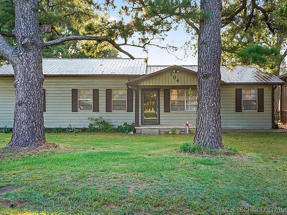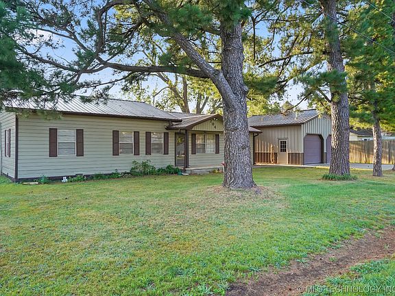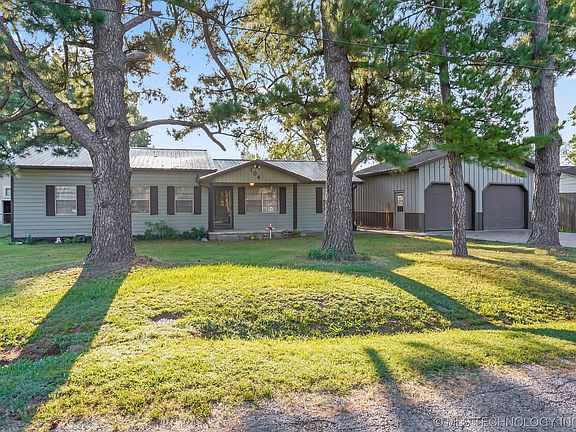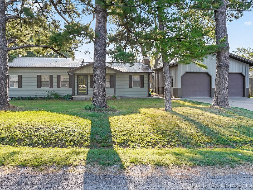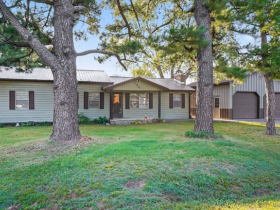 Charming 3 bedroom home on nice lot with large pine trees in the front yard and mature trees and storm cellar in the back yard. The home features extra large great room with wood burning fireplace & bookshelves on either side, kitchen open to the eating area, inside laundry room and spacious bedrooms. The detached 22x22 metal shop has room for 2 cars or would make great shop. See all this well maintained home has to offer.
