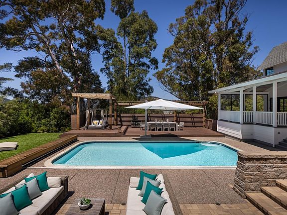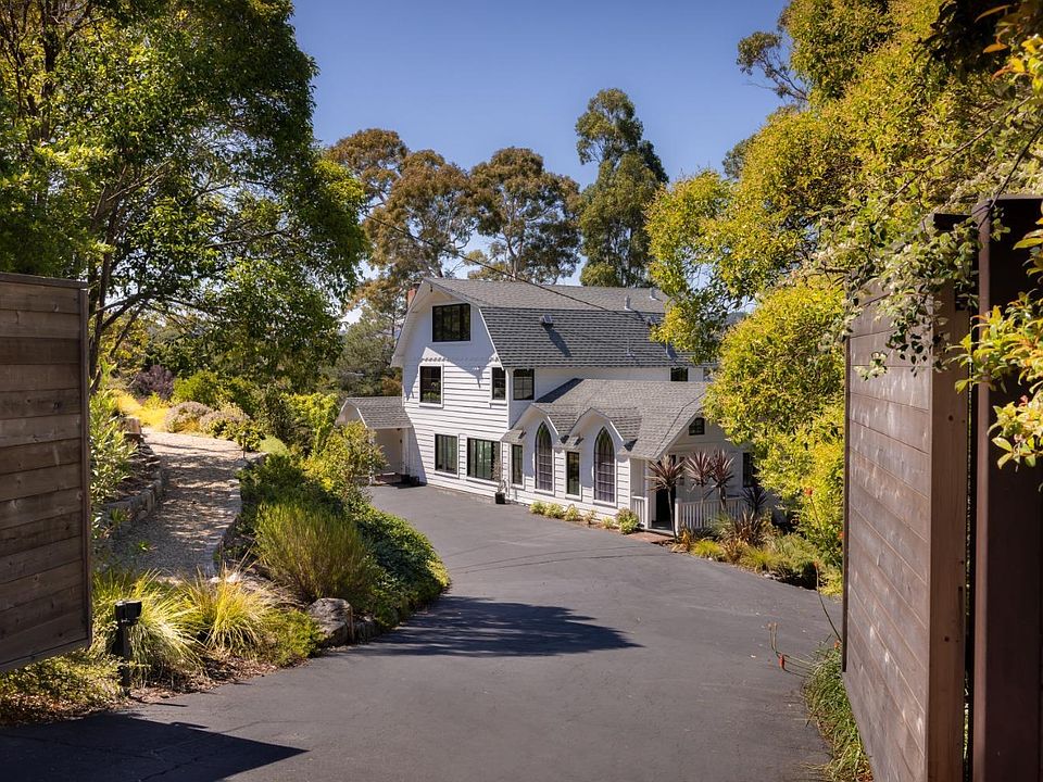 Welcome to 204 Tiburon Blvd, a gated farmhouse-style estate featuring 4 beds, 2.5 baths on a private ~1.14 acre lot. Revel in resort-style living with a saltwater pool, spa, and multiple outdoor spaces including a faux grass terrace, cabana, deck, covered porch with fire pit, and nature trails! Outdoor amenities include an outdoor shower, plumbed fire pits, and a cooking area with integrated gas grill. This amazing residence features incredible indoor/outdoor flow, perfect for entertaining. The chef's kitchen boasts an oversized island, stainless appliances, gas range, and a Subzero fridge. Motorized skylights, vaulted ceilings, and period stained glass add a layer of style. The primary suite offers 3 closets, garden views, and a luxuriously appointed bath. The main level also features a powder room, lounge area, and laundry. Just upstairs is the bedroom level with 3 beds and 1 full bath on the hall. Additional features include a top-floor rec/family room, lower-level office and gym, and 10+ car parking with a garage. Conveniently located near Greenbrae, Larkspur, and downtown San Rafael, with easy access to the Larkspur Ferry, Marin Country Mart, Bon Air Shopping Center, and Highway 101. This private oasis is where every day feels like a vacation- so go ahead- you've earned it!