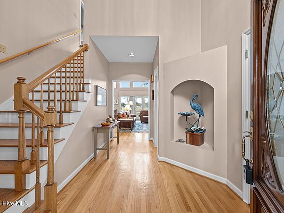 Experience the tranquility of this waterfront home with panoramic views of Broad Creek and the Pamlico River. This 3 bedroom, 2.5 Bath home has a master suite on the primary level along with a formal and informal dining, kitchen, great room, office, sunroom and laundry room. Upstairs you'll find two additional bedrooms and a full bath with skylight. The 2-car garage has a large workshop, plenty of storage and a trolley with chain hoist. Additional features of the home include whole house vacuum, a chair lift from the garage to the primary level and a dumbwaiter.