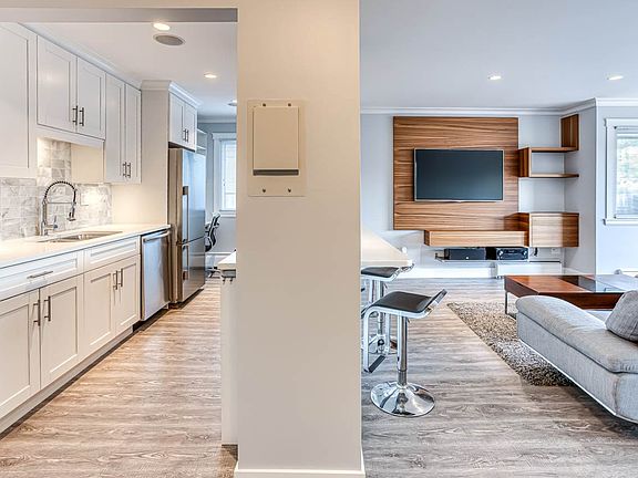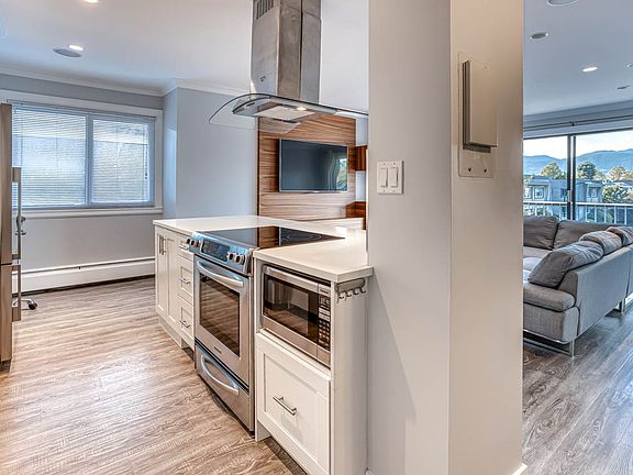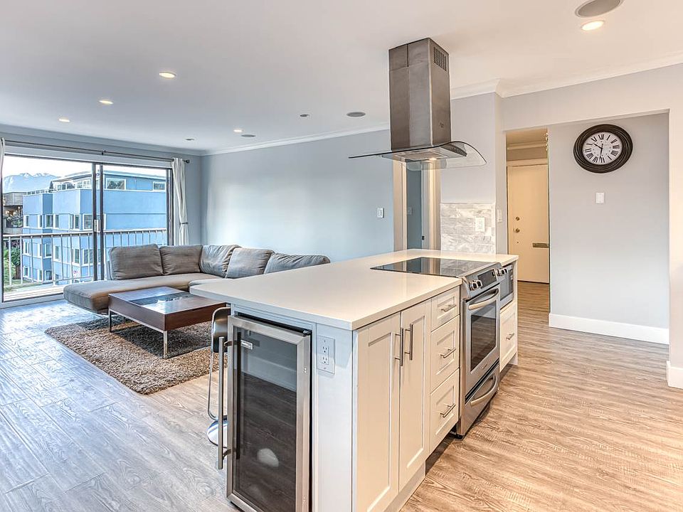 FULLY renovated Kits beach top floor corner unit 1 bed 1 bath. This North West-facing 717sqft condo features unobstructed mountain views, wrap-around balcony, and sneak peek views of the beach. Upgrades include SS appliances, quartz countertop kitchen island with built-in wine cooler, surround sound speakers and pot lights throughout, a custom black walnut entertainment wall (tv & audio included), and fresh paint throughout. Bathroom includes a frosted glass barn door and ceramic tile. SOLD fully furnished and move-in ready. 95 Walk score, steps away from the beach, shops, restaurants, and transit. First showings September 8. Call today to book a viewing because it won't last long. Private showings Sept 17, 5-7PM