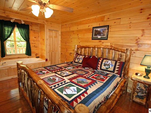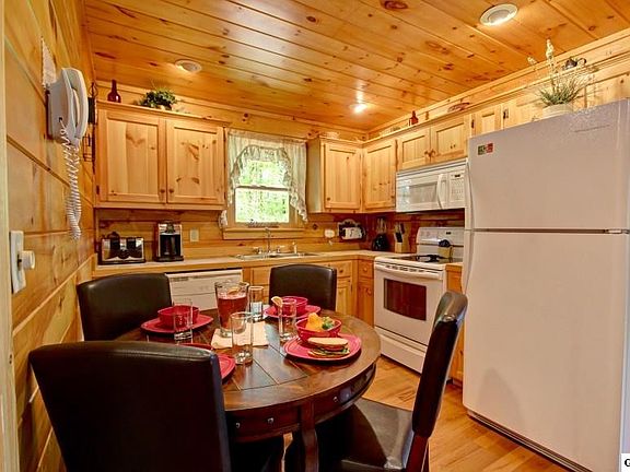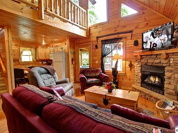 "Smokyview Seclusion" has two bedrooms and two full baths. It is located conveniently between Gatlinburg and Pigeon Forge. Entering on the main level you will see a lovely sitting room with a gas fireplace that adjoins the kitchen with its dinette that seats four. The first of two king suites containing a Jacuzzi tub is located on this main level. Upstairs you will find the second king suite along with a game area containing pool table and wet bar. Step out onto the upstairs covered deck from here and enjoy the view of Mt. Leconte. If you love BBQ, the great outdoor cooking and lounging patio is for you. This well-appointed cabin with its great personality allows you to sit and enjoy the view and its serenity whether you are inside or out.