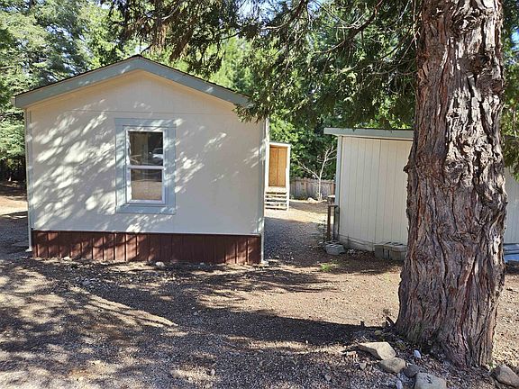 Beautifully private and treed parcel close to town. Fully fenced with secure privacy gating on 2 entrances, one on S Old Stage and one on Irene Lane. The home is stripped down for the next owner to re-create. There is a feeling of being nestled in on the land. There is a Quonset Storage Building with concrete slab, which will accommodate a vehicle or 2 stacked and storage. Two other outbuildings, one of which has the well pressure tank and storage. New pump installed on 5/8/2023. Well 137' deep, 15+ GPM. The home is a 3 bedroom, 2 bath, make it just what you desire, as it is ready for you to build it up and out to what your heart desires. There is an RV hookup for water and electric for a sewer contained unit. Cal Fire Defensible Space Clearance and Septic/Leach Field Repair and Cert in Assoc Docs. This home was moved from its original placement location, therefore, even with a 433, which it does not have, it will not qualify for conventional or FHA financing. VA a loans may allow a move after it's initial installation.