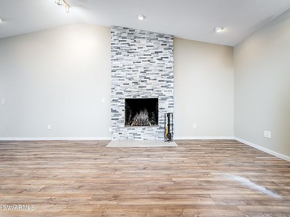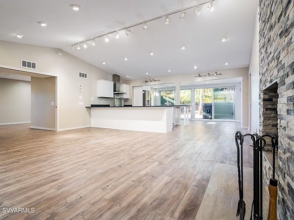 Fresh, sharp, open, contemporary in the heart of W. Sedona. No HOA fees. Completely redone. Perfect rental. Huge master entire length of house. All new kitchen, Wolf gas stove, granite counters. Tiled bathroom is also steam room. New roof, paint, flooring, drywall, stone fireplace. Heavy duty washer, dryer. Large, private, fenced backyard w. patio, hot tub, fountain & views of Thunder Mtn. Close to Sugar Loaf trailhead, shops and more. Buddha & crystals stay. Finished garage could be studio, work space. Tax records show 1180 square feet but not addition done by previous owner. See attached diagram showing 1297 sq. ft heated and cooled. 12 X 7 pantry/office and laundry area not included in square footage. Short term rentals ok.