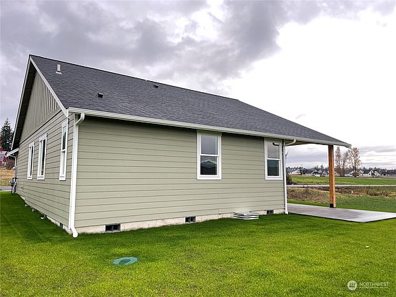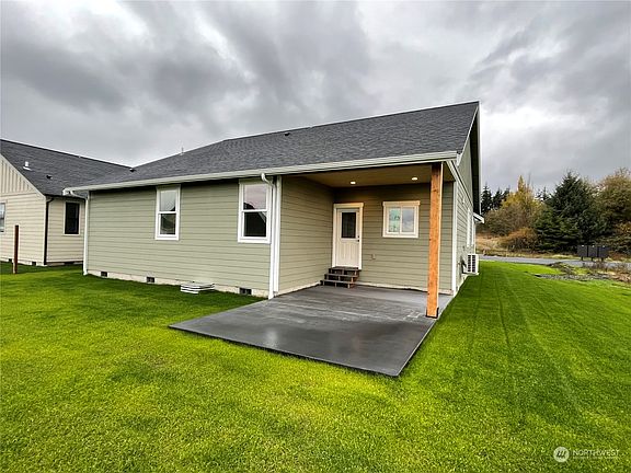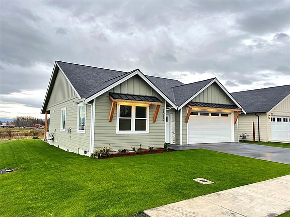 Lowest priced brand new home in Lynden! Located in the new community of Kamm Creek, this home sits on a private lot that is surrounded on two sides by green space! Boasting 3bds 2 full bath, open concept one floor living, vinyl plank floors, AC, a spacious kitchen with quartz counters, extra large 8' island with eating bar, pantry, mud room, and much more. Step out onto large fully covered back patio that has amazing views of the designated open space, the Twin Sisters and the gorgeous mountain ranges.
