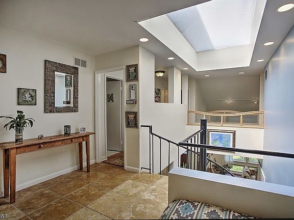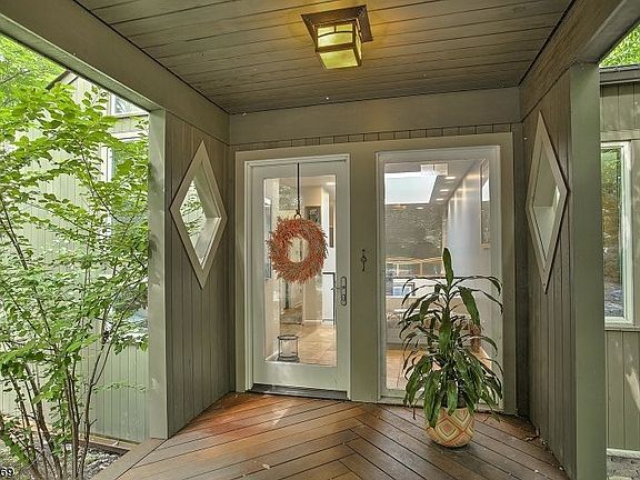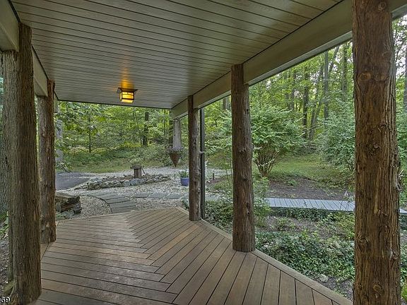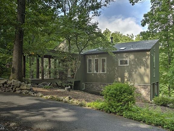 Set back substantially from the road, follow the driveway through the woods to find this beautifully updated custom home. Nestled into the landscape, the home offers 3 levels of living. Walls of windows provide an abundance of natural light and integrate the inside and the outside. The home, with new roof (2014) and wood siding (2012) also features an awesome 2012 kitchen w/ stainless appliances, large center island & custom cabinets. Doors from the kitchen provide access to a multi level expansive deck that overlooks an grassy lawn. A wood burning FP is the focal point of the living room. Hard wood floors throughout. The top floor offers 3 bedrms, den and laundry room. The walkout lower level provides a carpeted play rm and yard access . This 5 acre property offers a weekend retreat all week long!