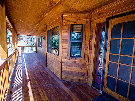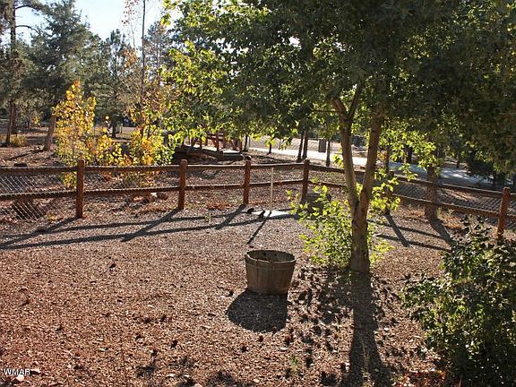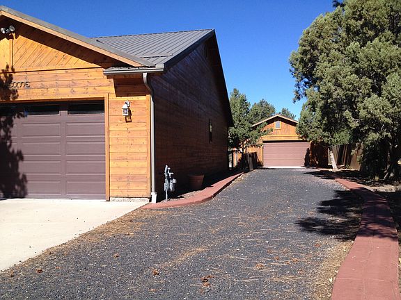 Beautiful single level cabin with two garages for sale in Show Low, AZ. Home features three bedrooms and two bathrooms. Open floor plan with T & G vaulted ceilings, hardwood floors, gas fireplace, solid surface counters, Kinetico water softener, two car garage, air conditioning and more. (No carpeting in the main house.) Separate garage in back also has tons of storage, could be workshop? It is 384 sf. Low maintenance yard; back completely fenced. Small fenced area in front. Metal roof on main house. All of this on almost an acre in the middle of town. Lot is .93 acres. No HOA.